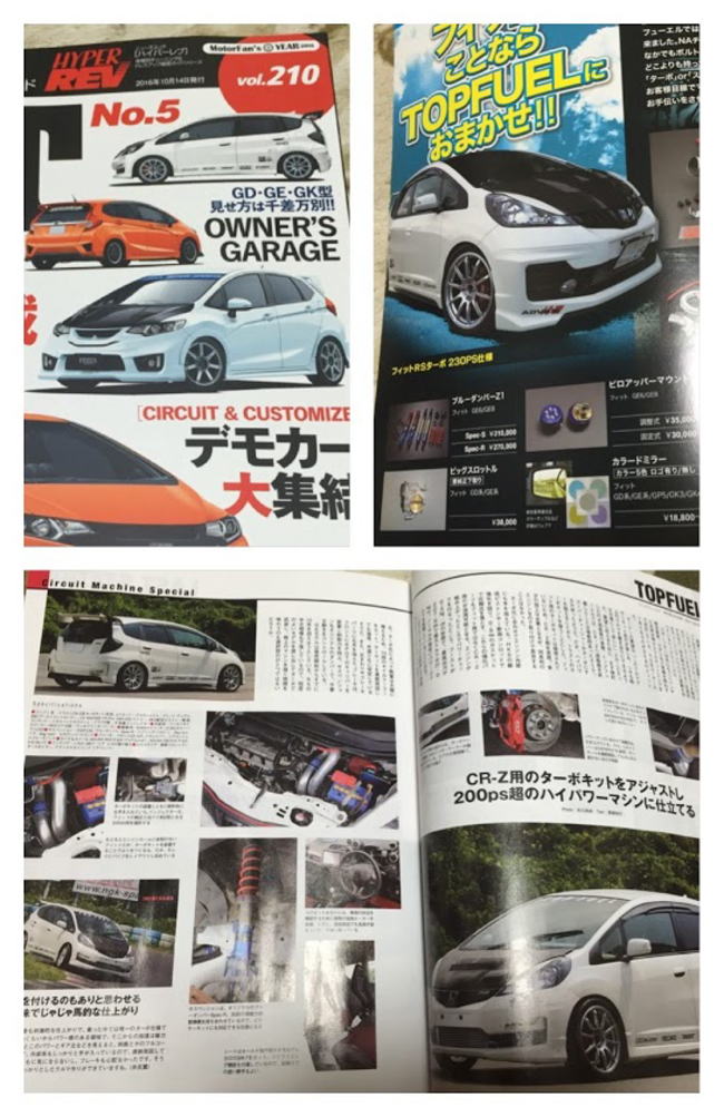 2016年9月 HYPER REV FIT vol210にてパーツショップTenのFITターボが株式会社トップフューエルのデモカーとして紹介されました。