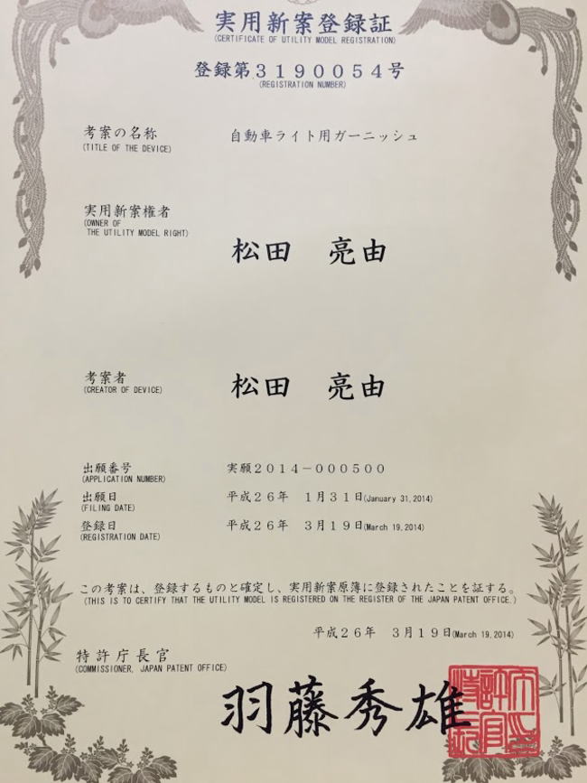 登録第3190054号 考案の名称:自動車ライト用ガーニッシュ